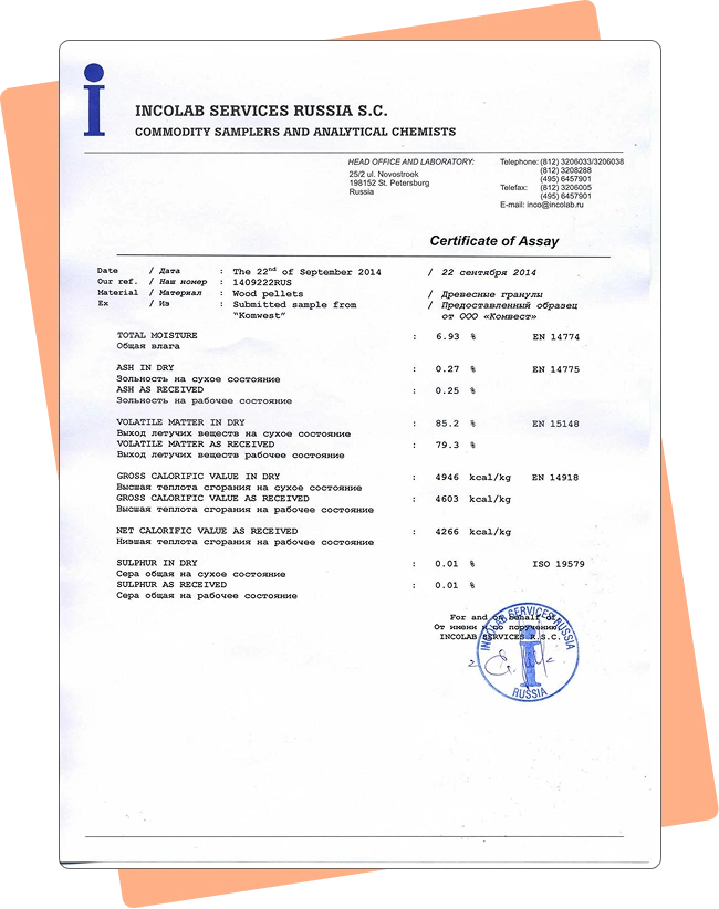 В 2014 году был получен Акт испытания пеллет в аккредитованной лаборатории INCOLAB, подтверждающий высокое качество пеллет для работы на международных рынках.
